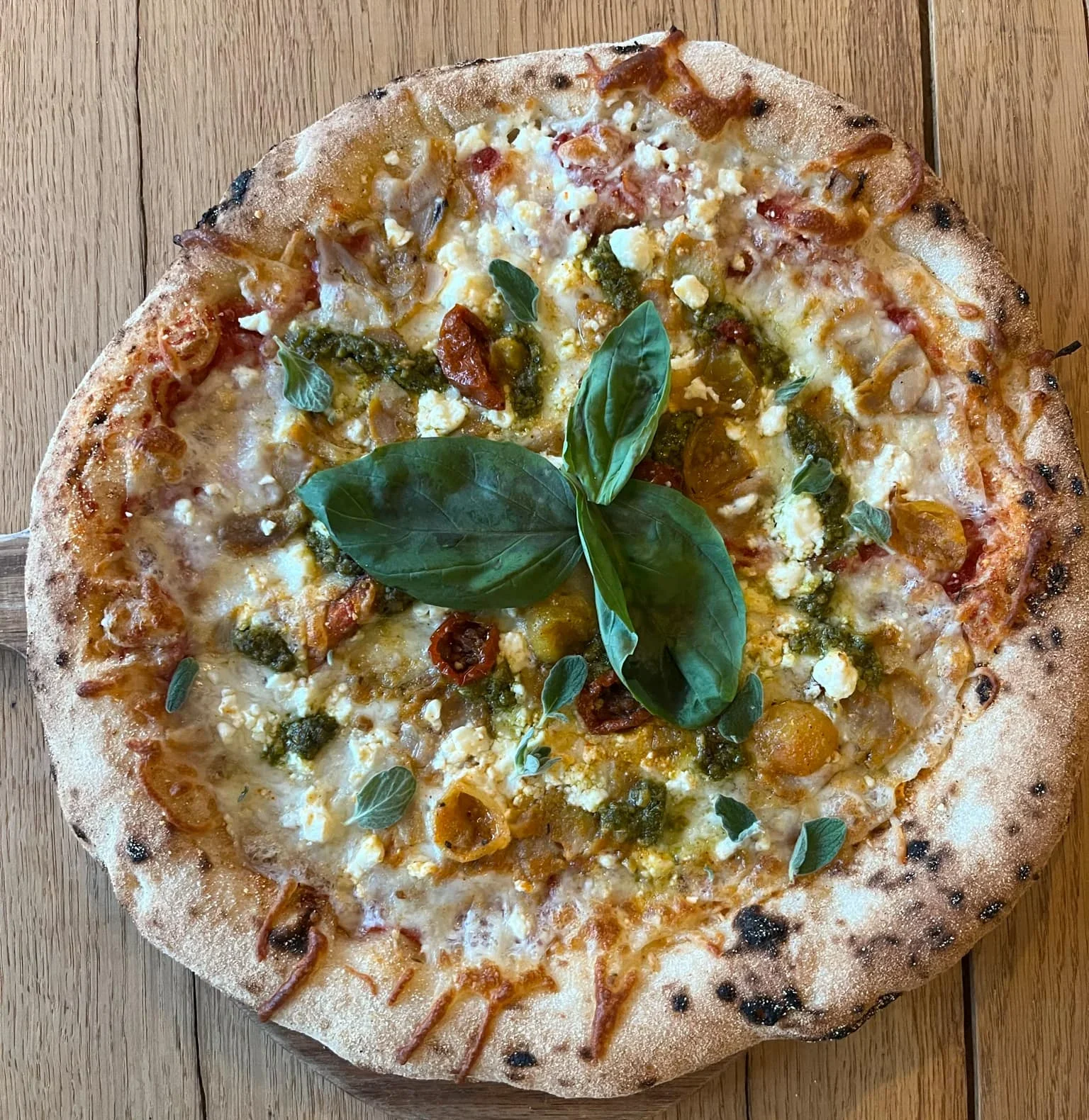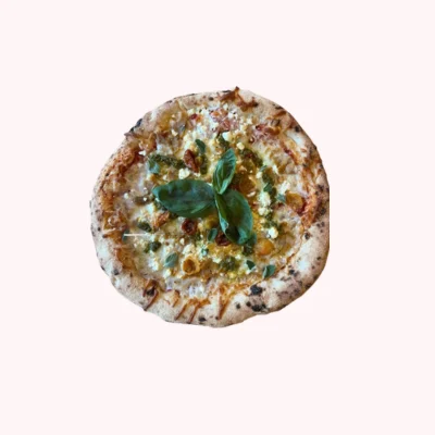 Surdejspizza // Tomatsauce // Fior Di Latte Mozzarella // Kyllingekebab // Feta // Basilikumspesto // Soltørrede tomater // Oregano & Basilikumsblade