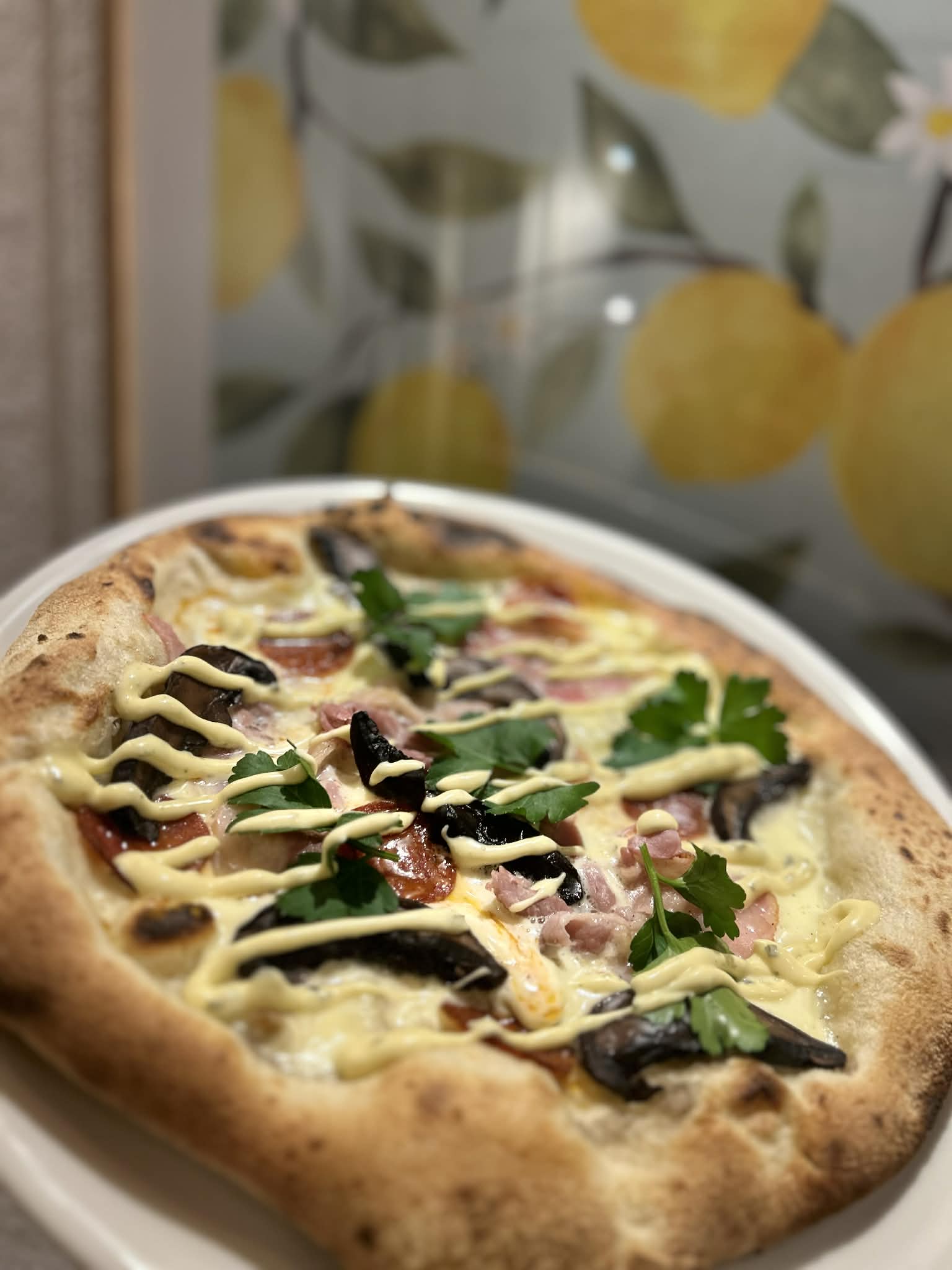Surdejspizza // Mascarpone // Fior De Latte Mozzarella // Dansk Produceret & Økologisk Pepperoni // Langtidsstegt & Røget Bacon // Bløde Løg // Smørstegte Svampe // Cremet Bearnaise // Persille