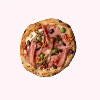 Surdejspizza // Tomatsauce // Mozzarella // Italiensk skinke // Oliven // Syltede Svampe // Oregano & Basilikumsblade