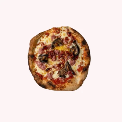 Surdejspizza // Tomatsauce // Mozzarella // Italiensk Salsiccia // Grillede auberginer // Soltørrede cherrytomater // Pinjekerner // Basilikum