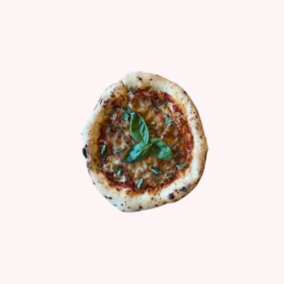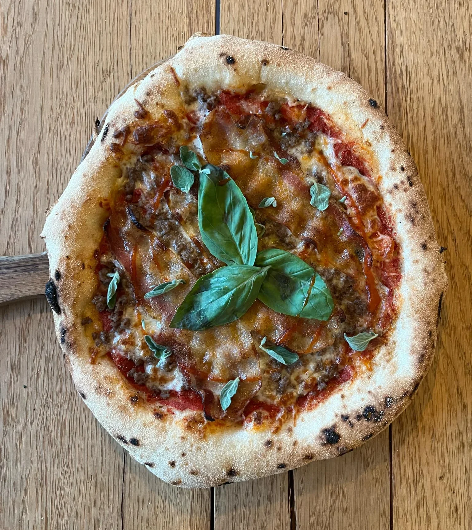 Surdejspizza // Tomatsauce // Fior Di Latte Mozzarella // Krydret oksekød // Pancetta (bacon) // Chilisauce // Frisk Oregano & Basilikumsblade