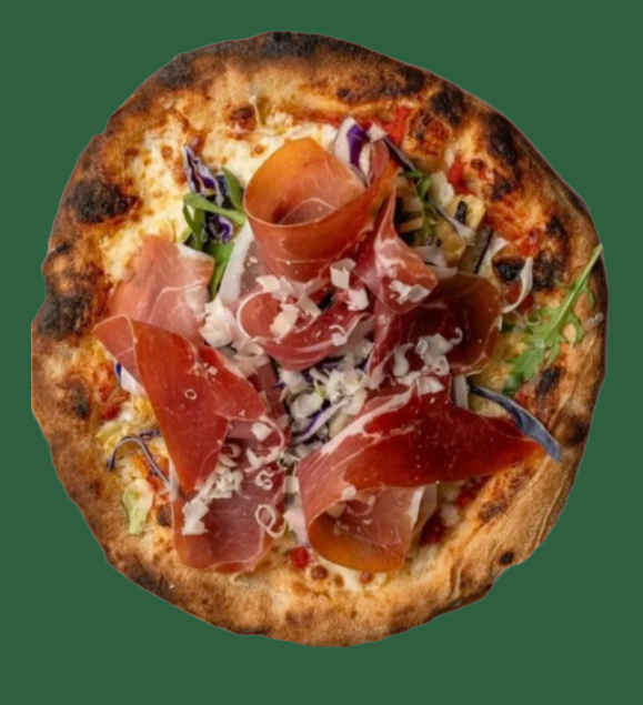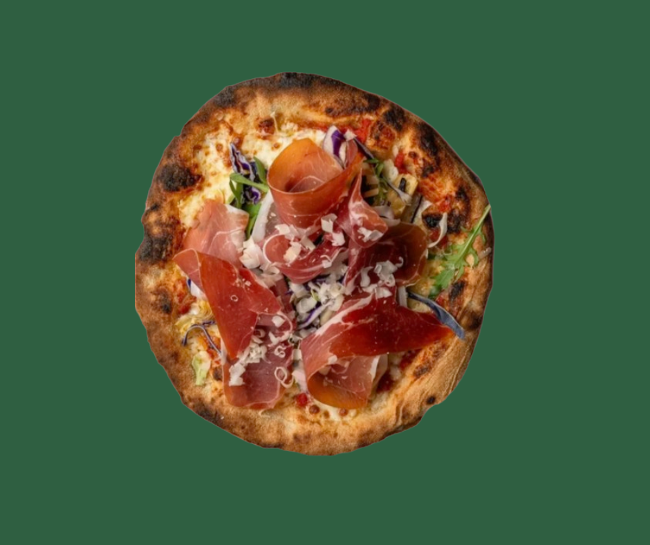 Tomatsauce, Fior De Latte Mozzarella, 24-måneders Serranoskinke, Godtfolkets Kålsalat, Parmesan & Friske Urter