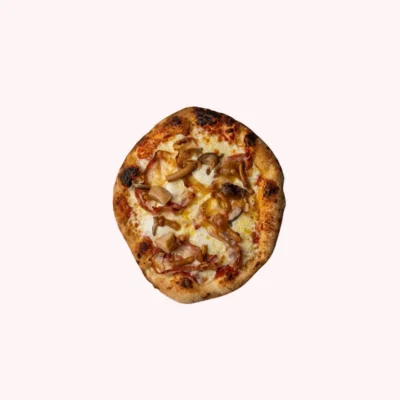 Surdejspizza // Tomatsauce // Fior Di Latte Mozzarella // Italiensk Pancetta (bacon) // Smørstegte Portobello // Stracciatella Di Burrata // Olivenolie m. Sommertrøfler // Gratis Tilvalg: Oregano & Basilikumsblade